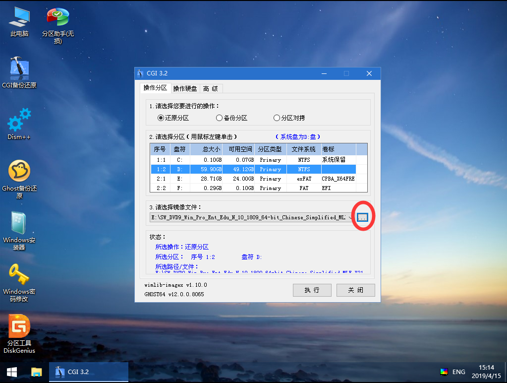 4、选择“还原分区“和选择需要还原的分区(安装系统之前请确认安装前C盘大小,根据磁盘大小确认需要还原发分区)
