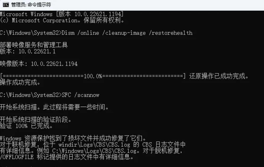 第二串命令会检查所有Windows 系统文件,并替换任何损坏或丢失的文件。